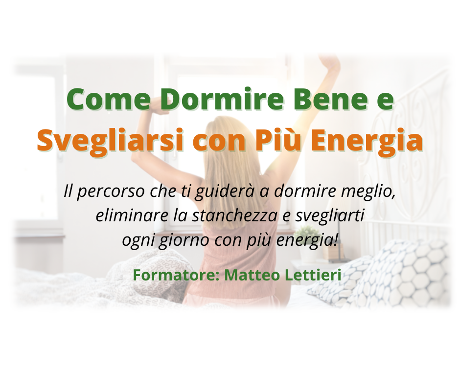 Sto realizzando un corso online per aiutare le persone a eliminare i disturbi del sonno più comuni (insonnia, narcolessia, jet lag, russamento e squilibrio dei ritmi circadiani), e lo stress accumulato per dormire meglio e svegliarsi ogni giorno con più energia.