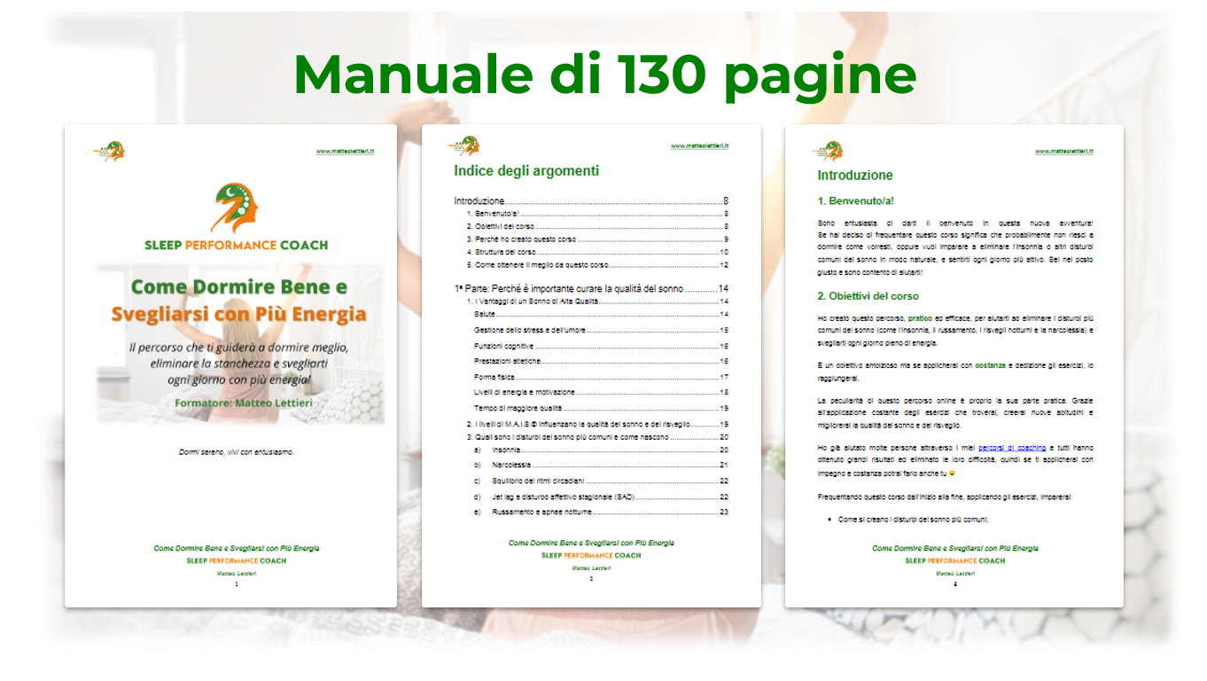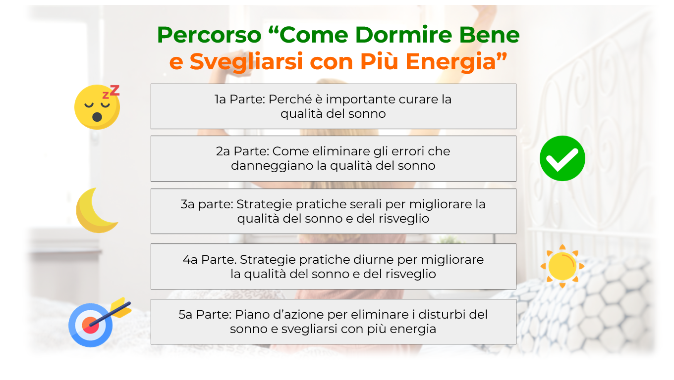 Non sarà solo un corso online, ma un vero e proprio percorso pratico con esercizi e strategie utili per eliminare cattive abitudini di sonno, gestire lo stress e imparare a rilassarti profondamente e creare un sonno e un risveglio mattutino di alta qualità.